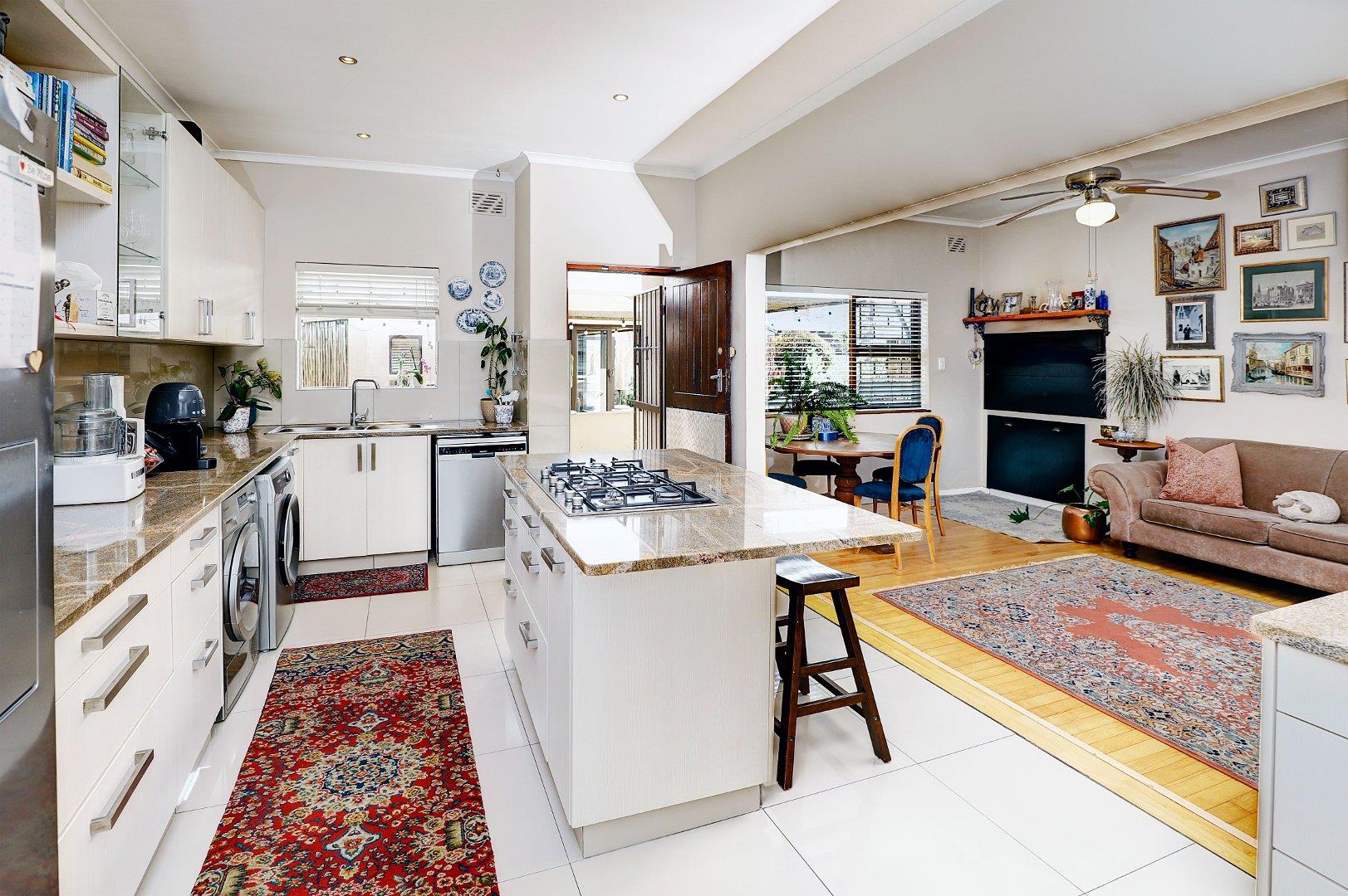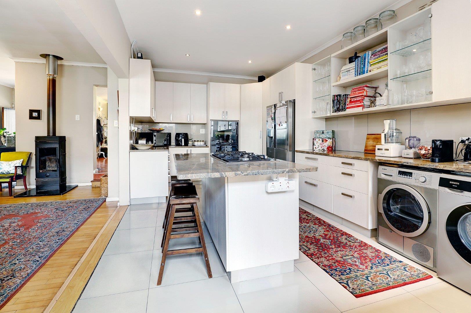 The beautiful kitchen has an open plan design with granite countertops, ample cupboard space, centre island with a large gas hob, eye-level oven and space for a double fridge.
