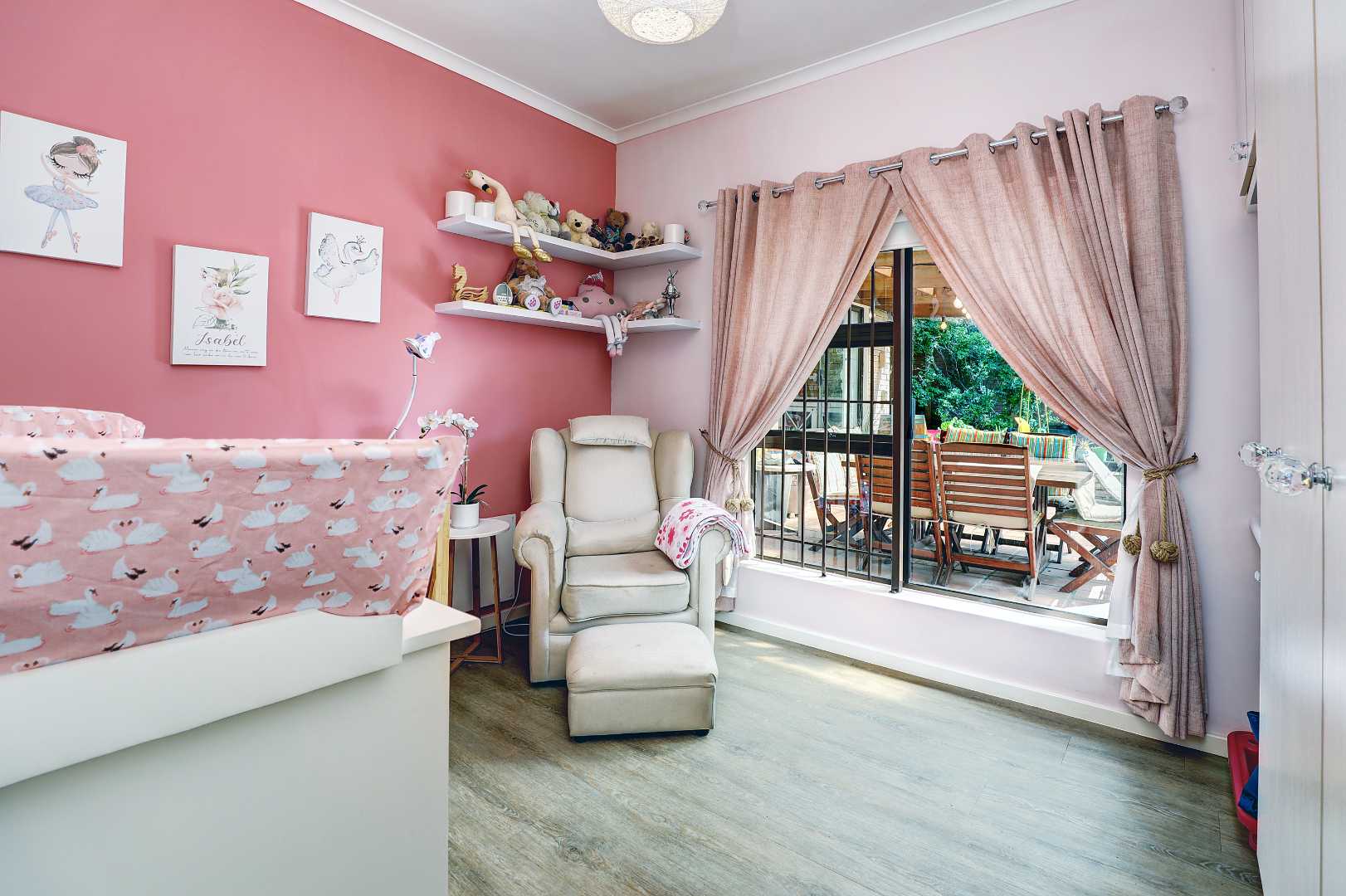 Also comprising of three vinyl floored bedrooms one of which the well sized master bedroom with ample cupboards and full en suite bathroom. The two remaining bedrooms share a full family bathroom. The double automated garage, with a cupboard and shelving space, has direct access to the home.