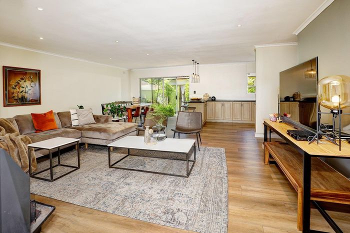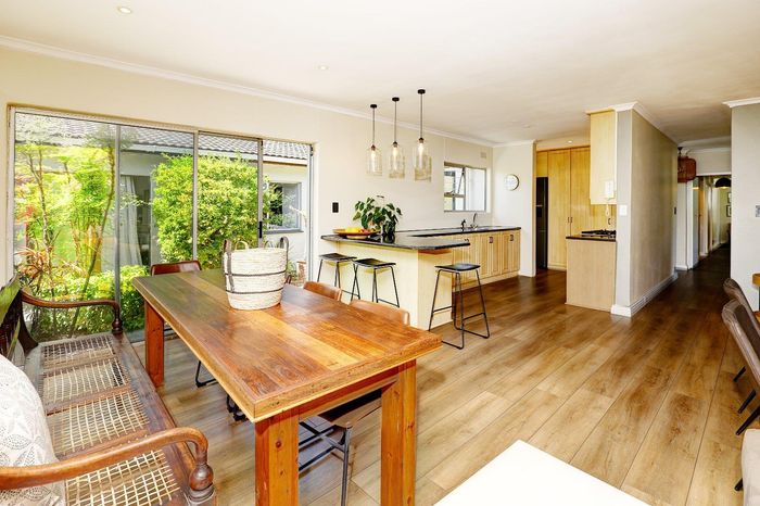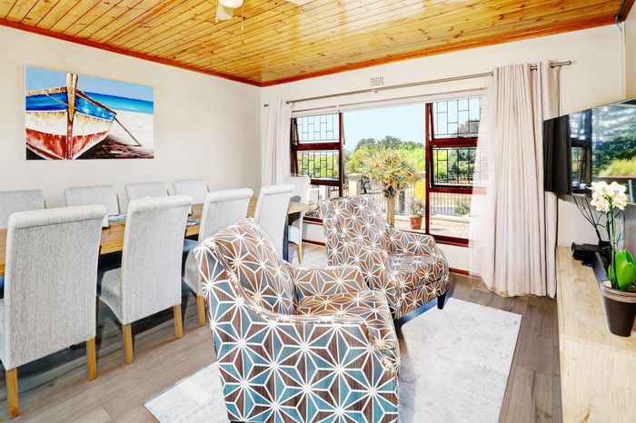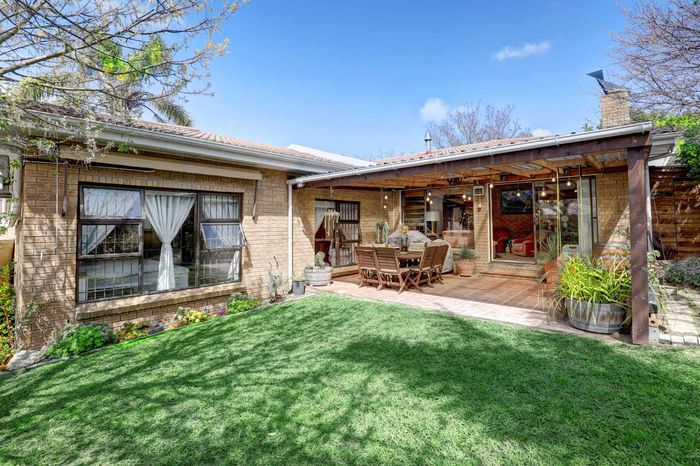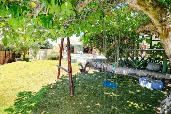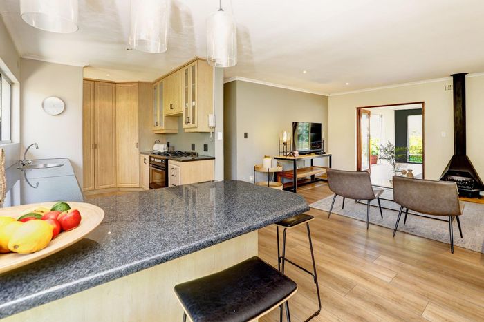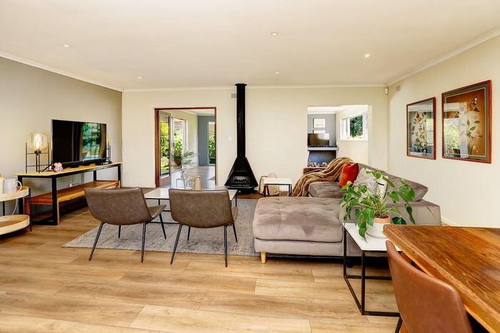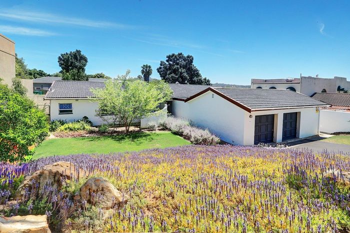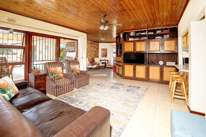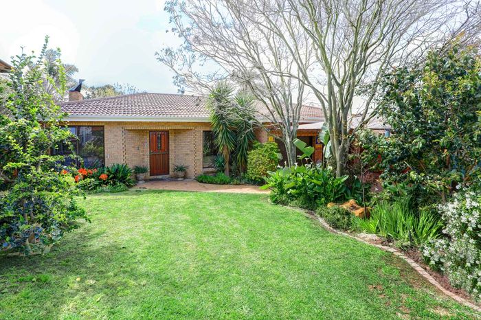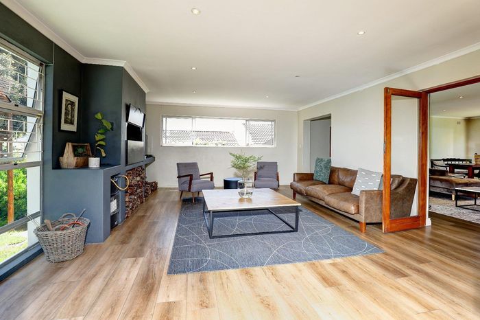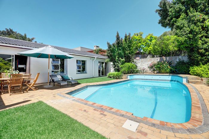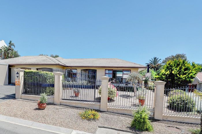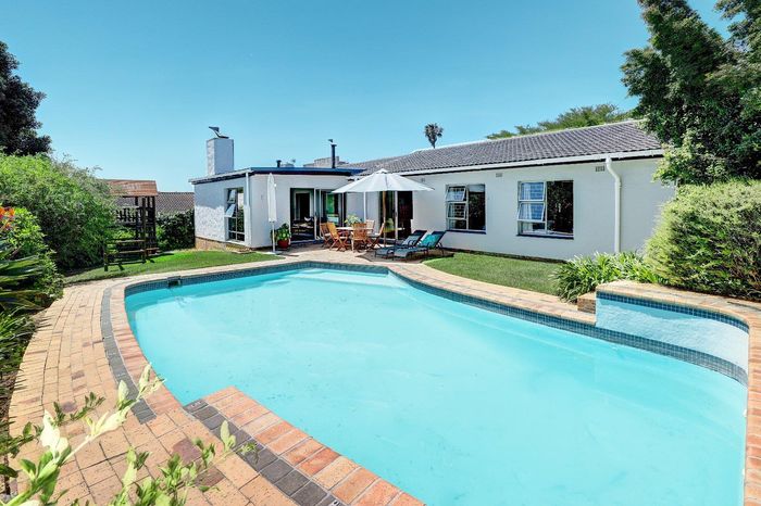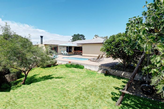 Four-bedroom home with open plan living, outdoor braai, heated pool, large garden, and multiple garages in a convenient location.