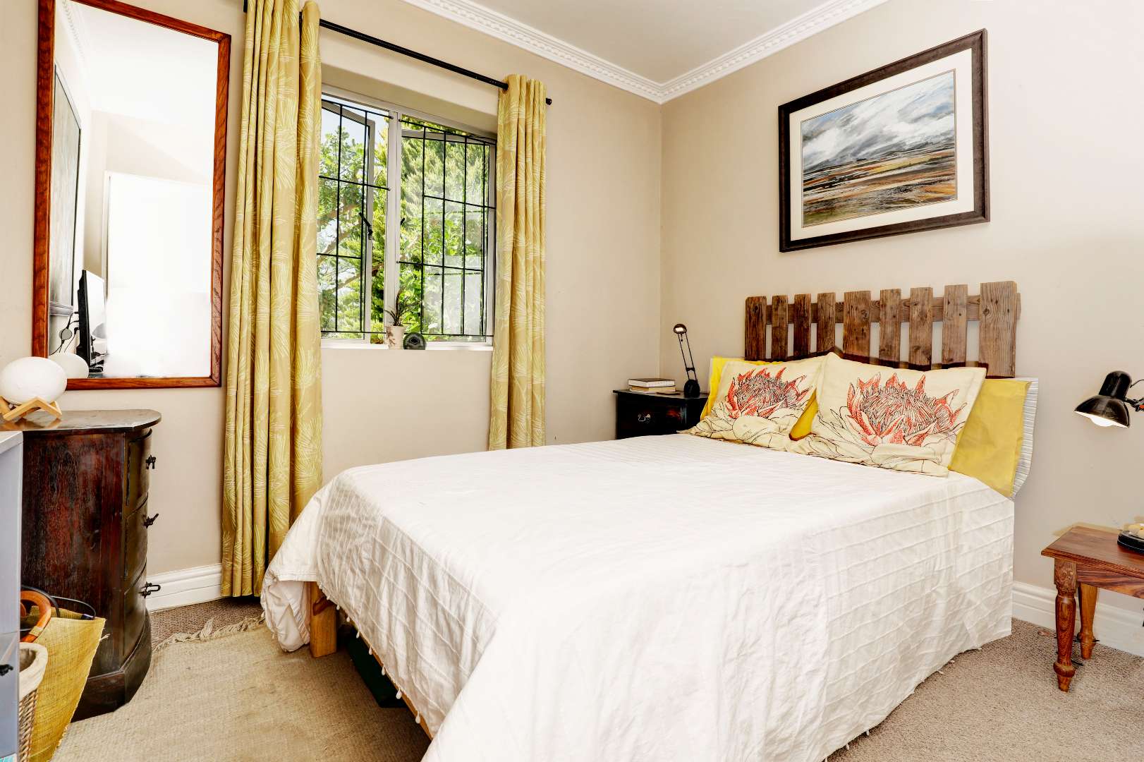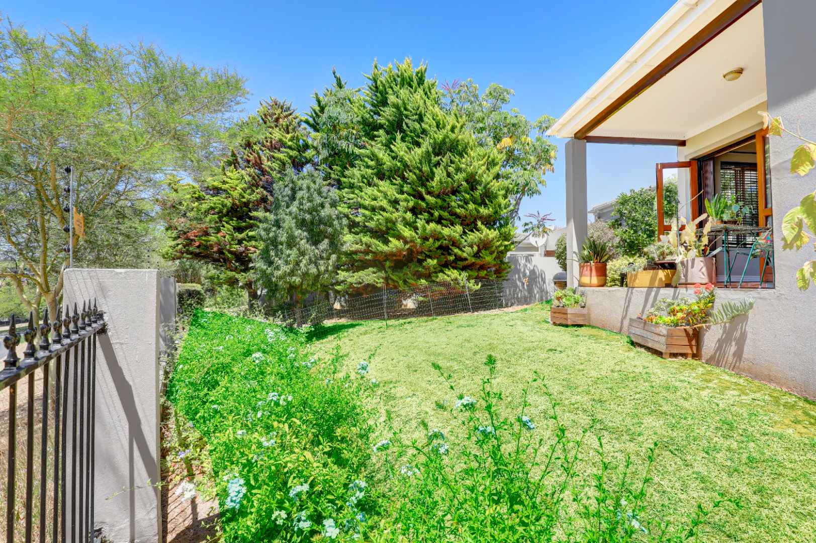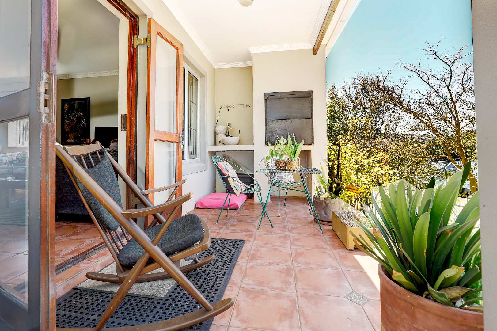 The sunny, spacious, open plan, living areas open up to and under cover braai patio, established garden & views of the Boland mountains, ideal for indoor outdoor entertaining.
