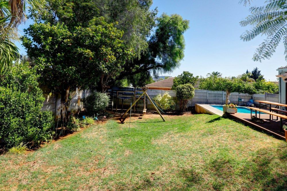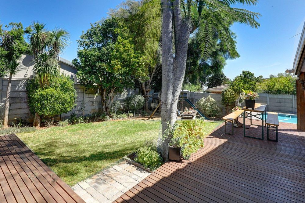 The open plan dining and living area leading to the braai room and both leading out to the landscaped garden, complete with wooden deck, sparkling pool and jungle gym for the kids, makes this the ideal home for entertaining.