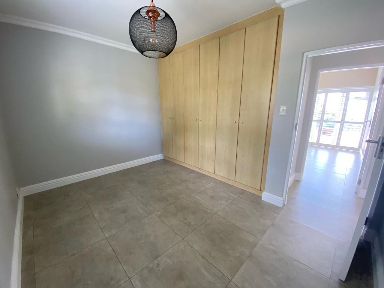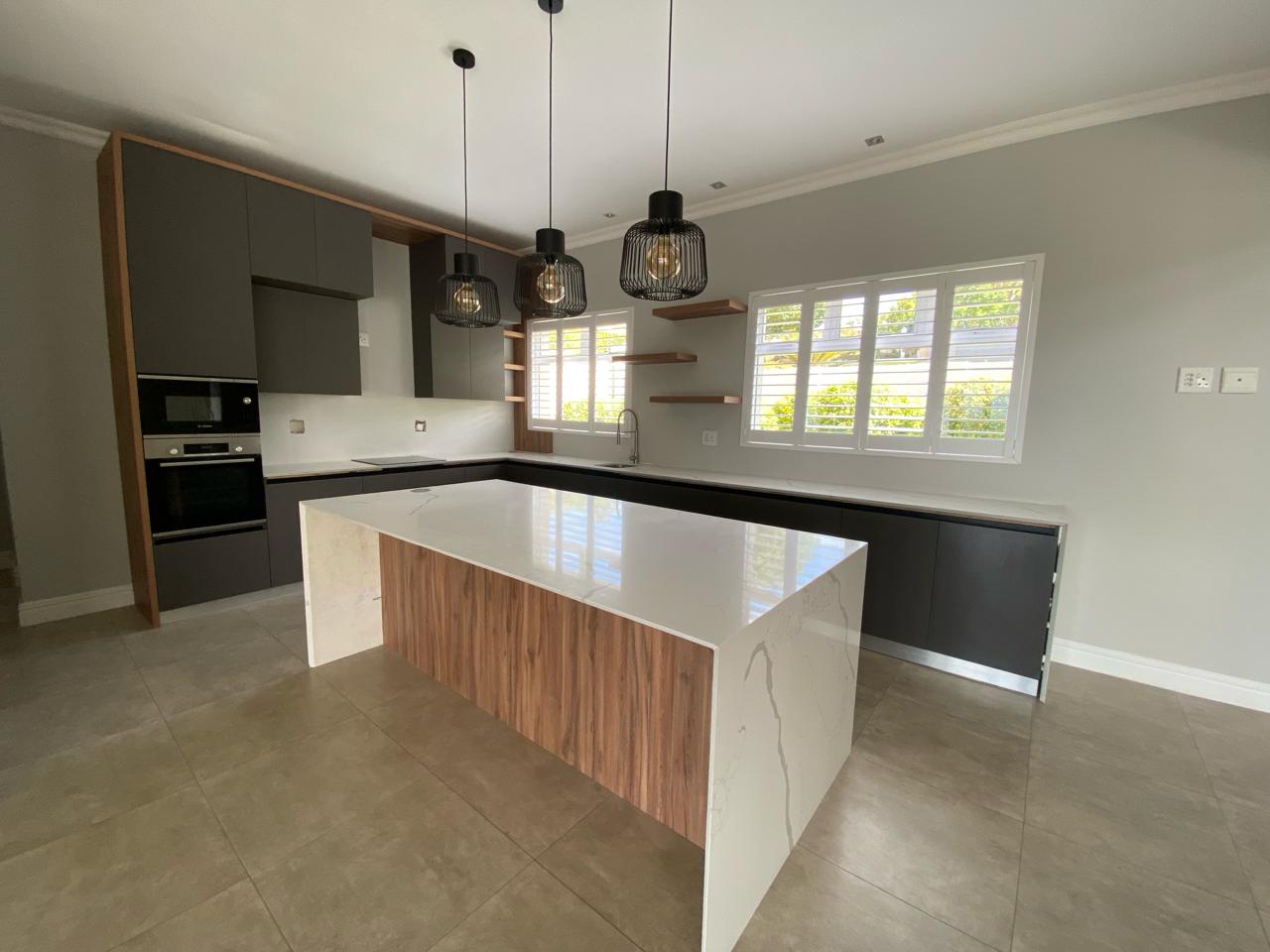 The sleek, modern kitchen and scullery are thoughtfully designed with grey cabinetry that complements the TV unit in the open-plan lounge. Engineered stone countertops in white with a subtle light grey marble effect are enhanced by warm wood accents. The kitchen is fully equipped with an electric stove, hob, and built-in microwave, while the spacious scullery includes two water points.