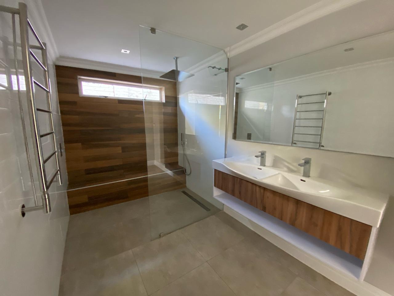 The master bedroom boasts a contemporary en-suite bathroom complete with a large shower, double basin, and toilet. A full family bathroom and a separate guest toilet add convenience for both residents and visitors.