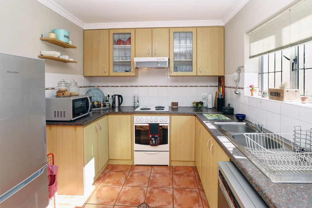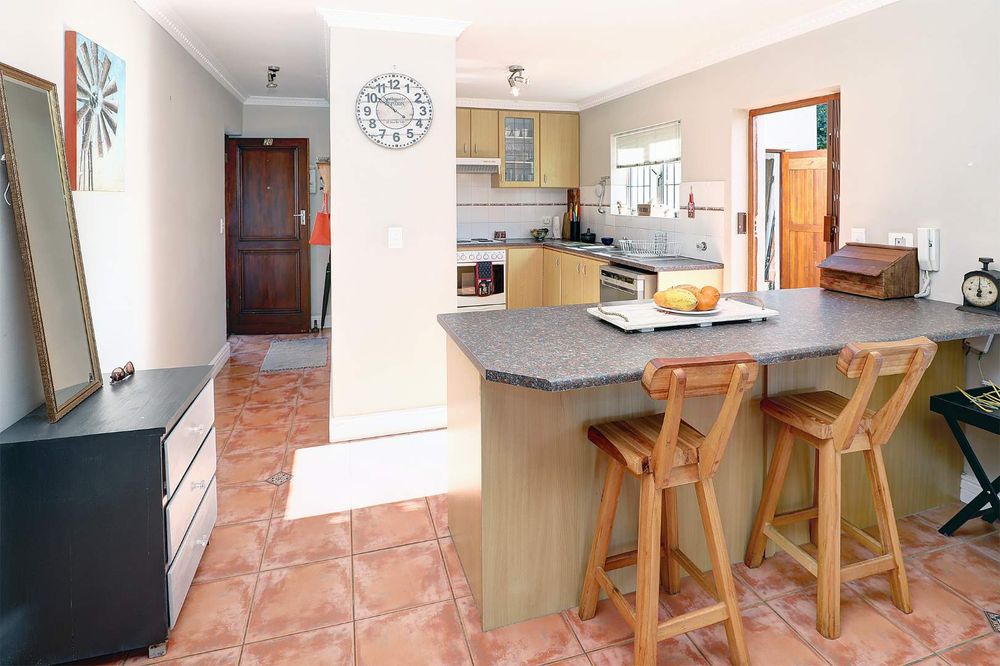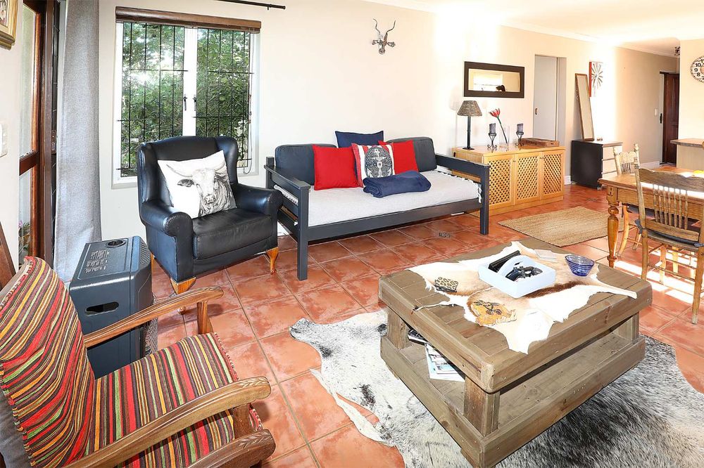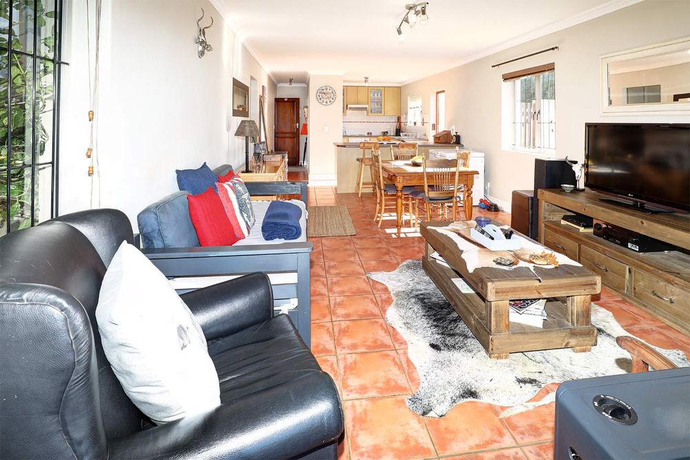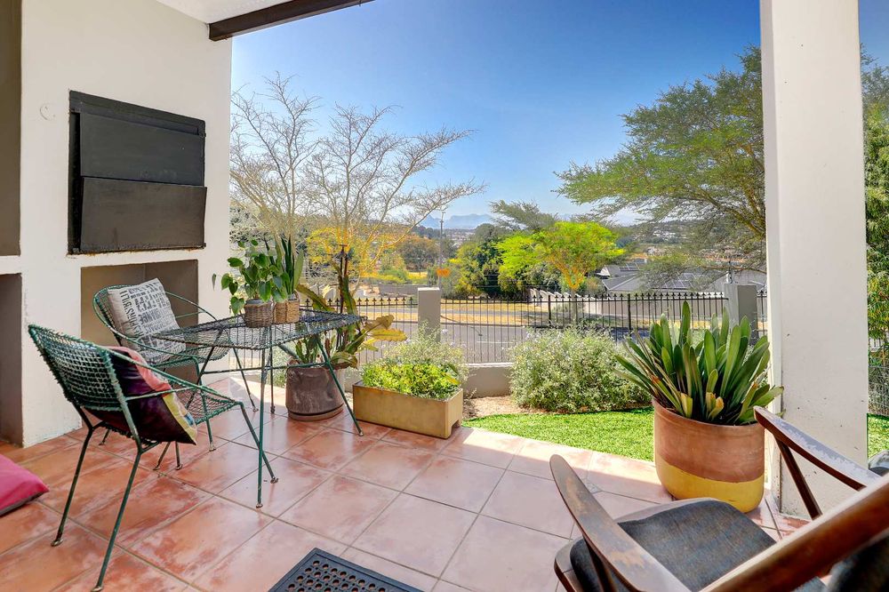 The sunny, spacious, open plan, living areas open up to and under cover braai patio, established garden & views of the Boland mountains, ideal for indoor outdoor entertaining.