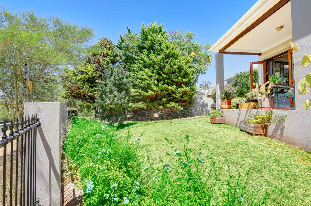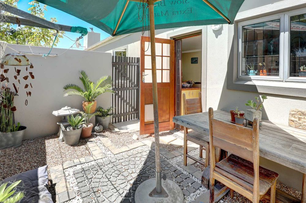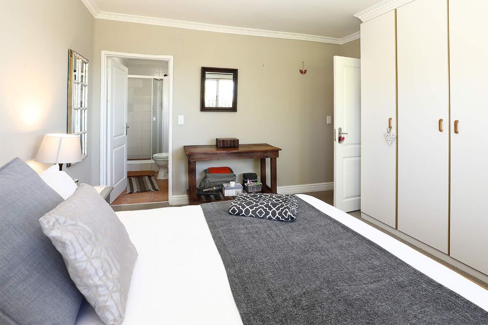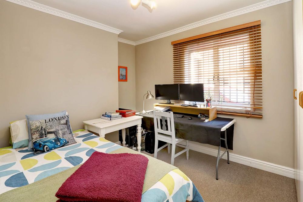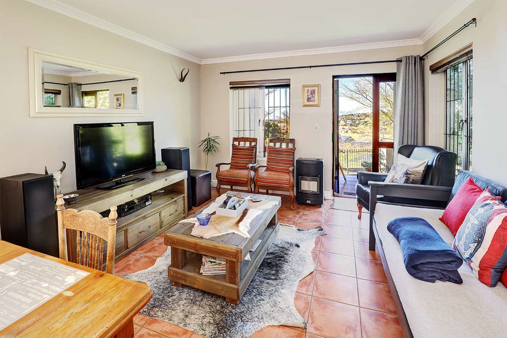 The sunny, spacious, open plan, living areas open up to and under cover braai patio, established garden & views of the Boland mountains, ideal for indoor outdoor entertaining.