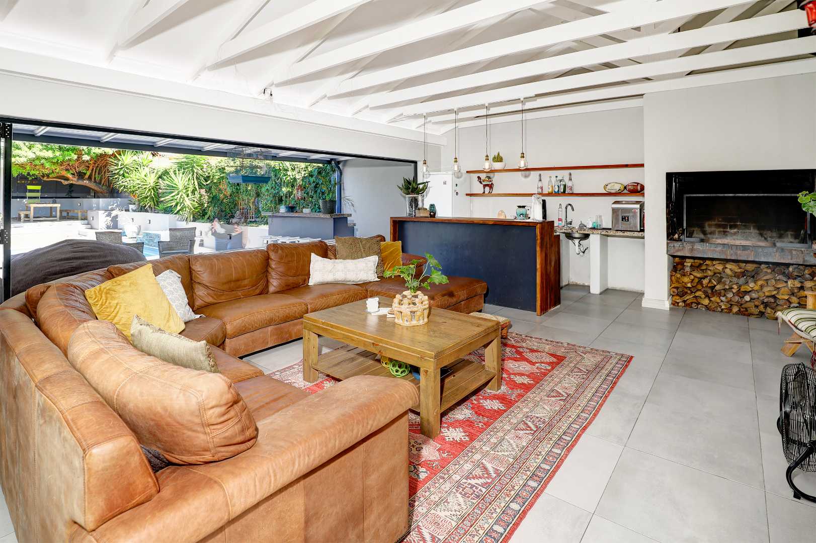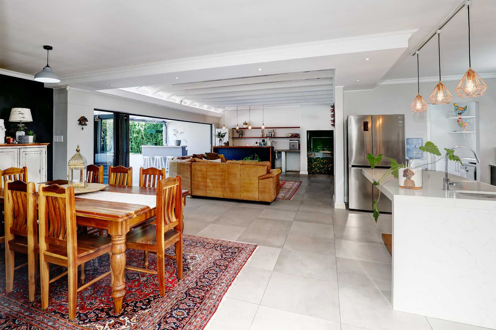 The open plan kitchen with scullery flows into the spacious entertainment area, with dining room, built in braai and bar. Enjoy direct access through the stackable doors to the inviting, private pool area with outdoor bar and boma.