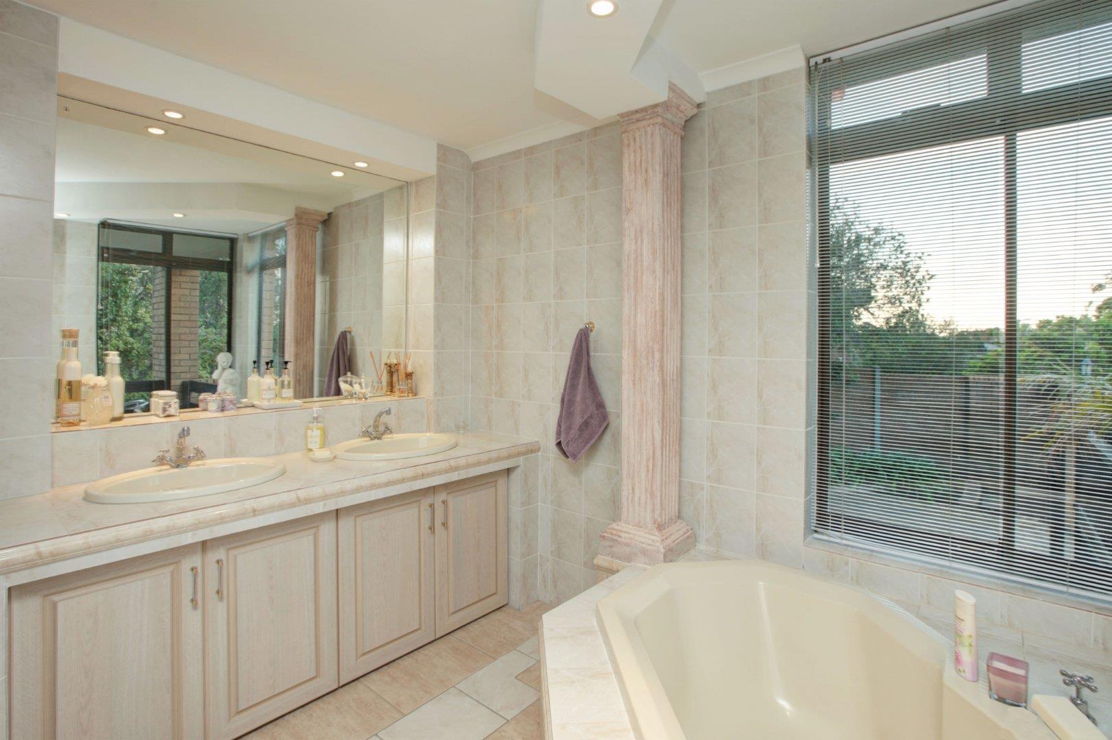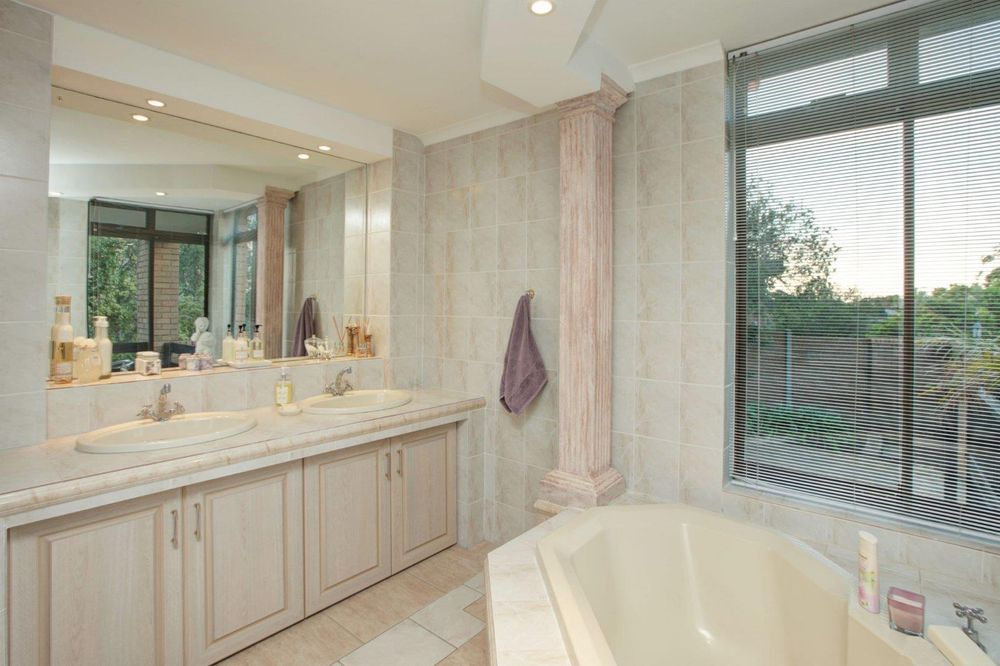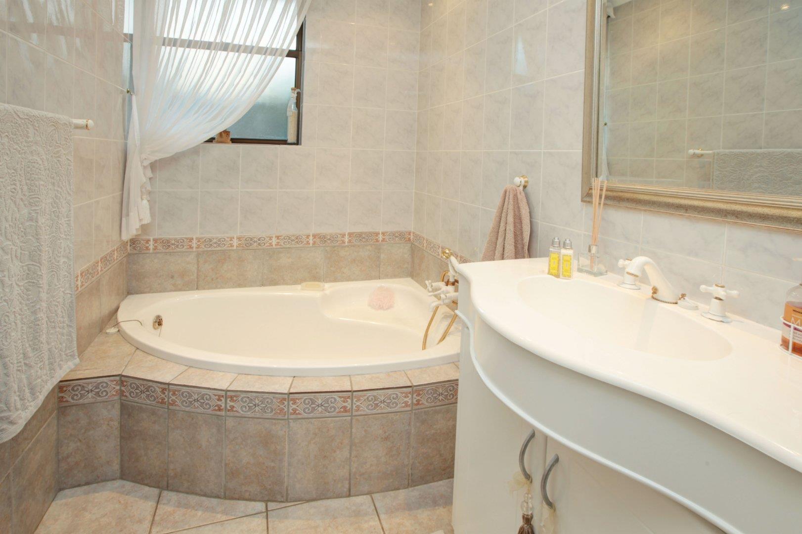 Spacious family home with 4 bedrooms, 3 bathrooms, lounge, family room, dining room and study. The kitchen has an under counter oven, extractor fan, granite tops and also has a quaint breakfast nook. The large main bedroom (with en-suite) leads out onto the balcony that overlooks the Boland Mountains. 3 garages, storeroom, staff quarters and a full garden apartment with separate entrance.