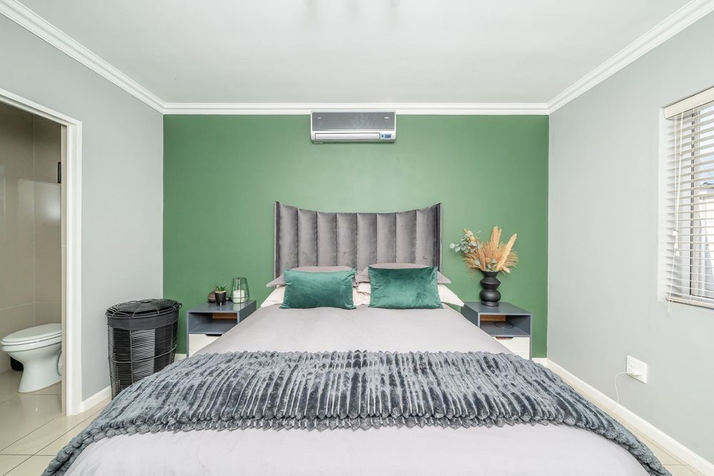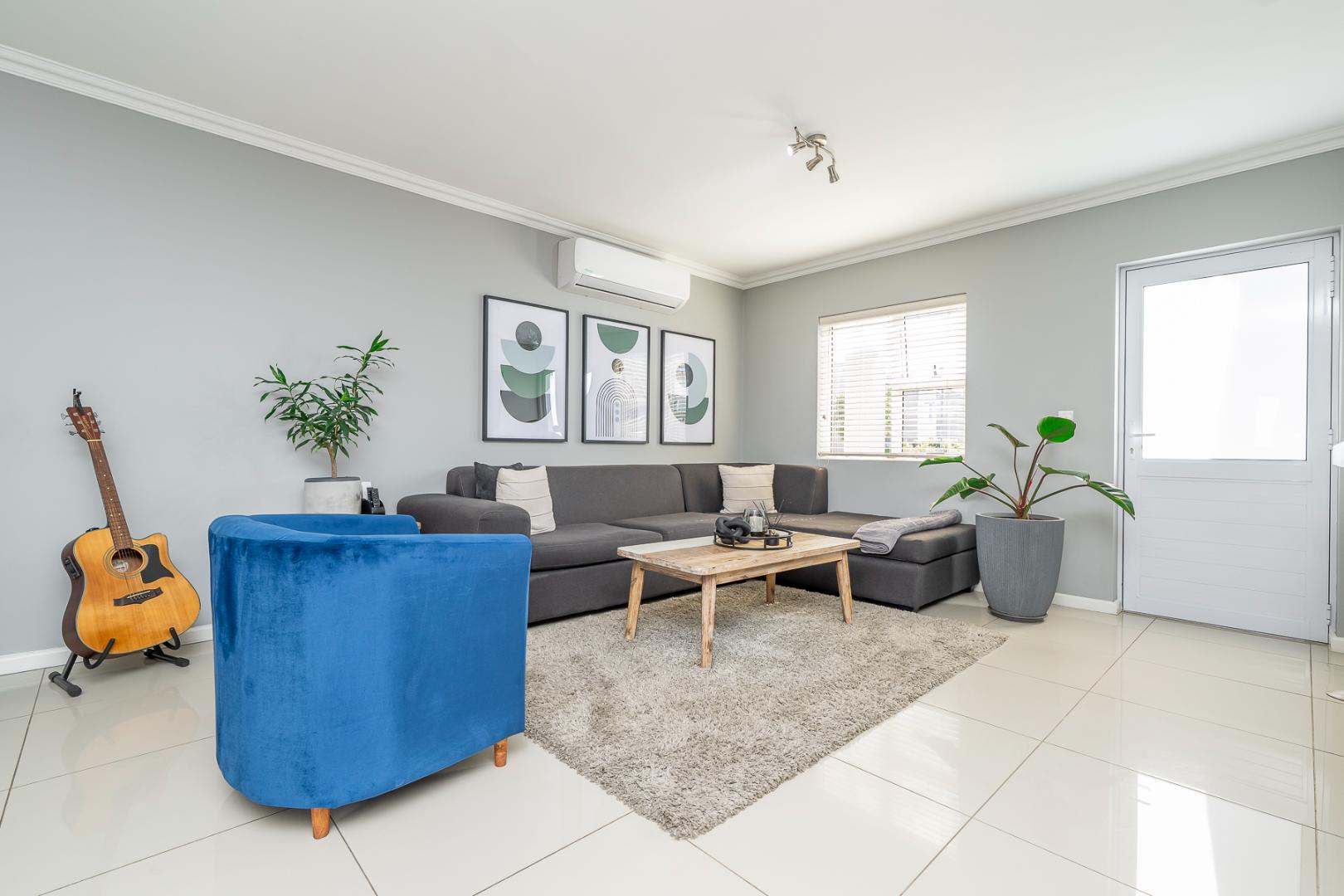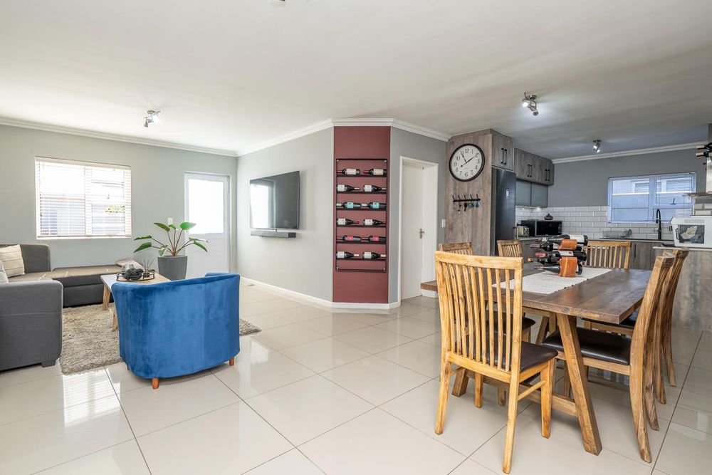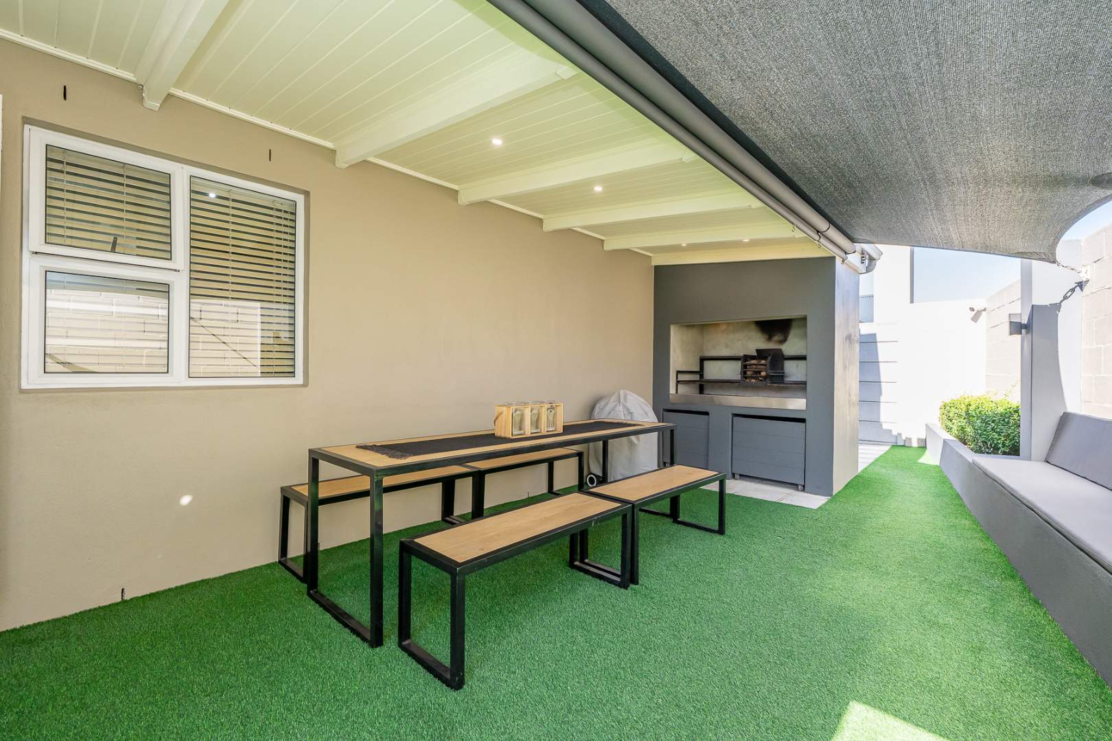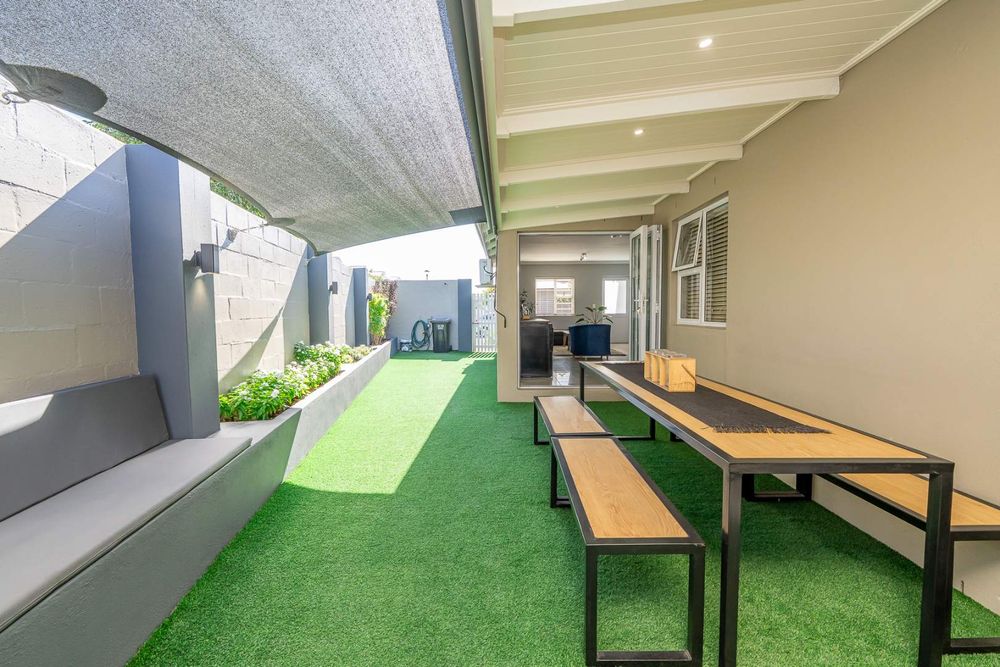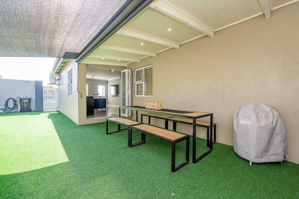 The open-plan living area, also air-conditioned, creates a light and inviting space and flows seamlessly to the outdoor area through stacking doors. Enjoy entertaining on the covered patio with a built-in braai, perfect for year-round use.