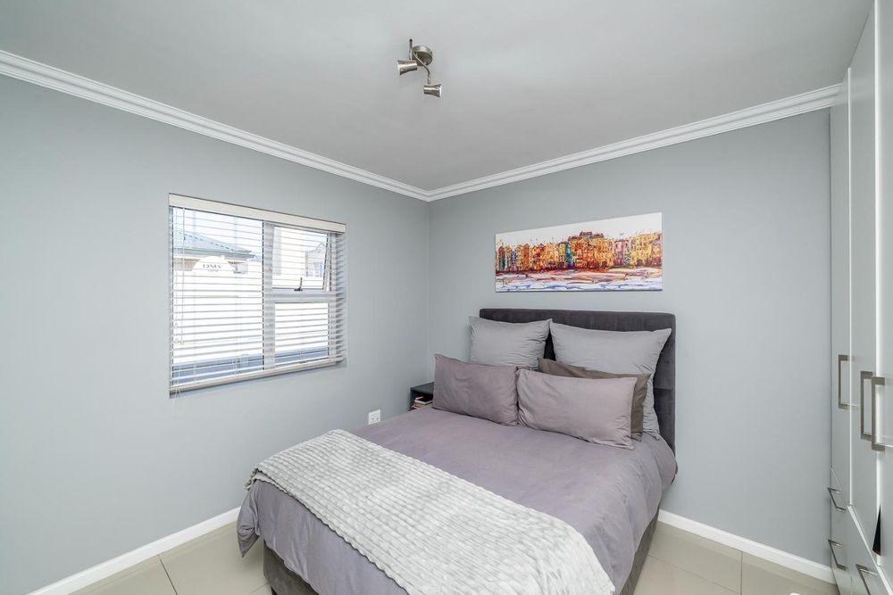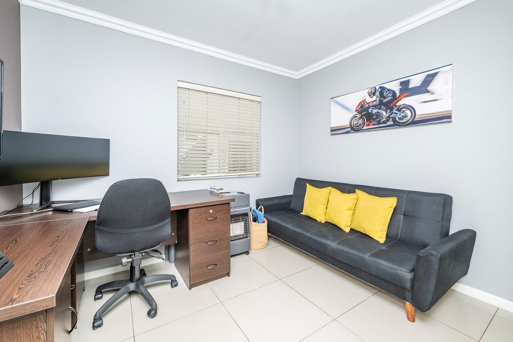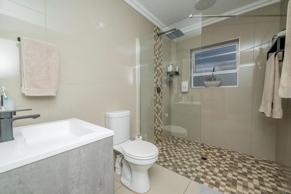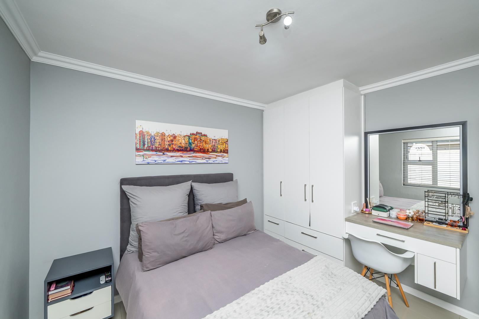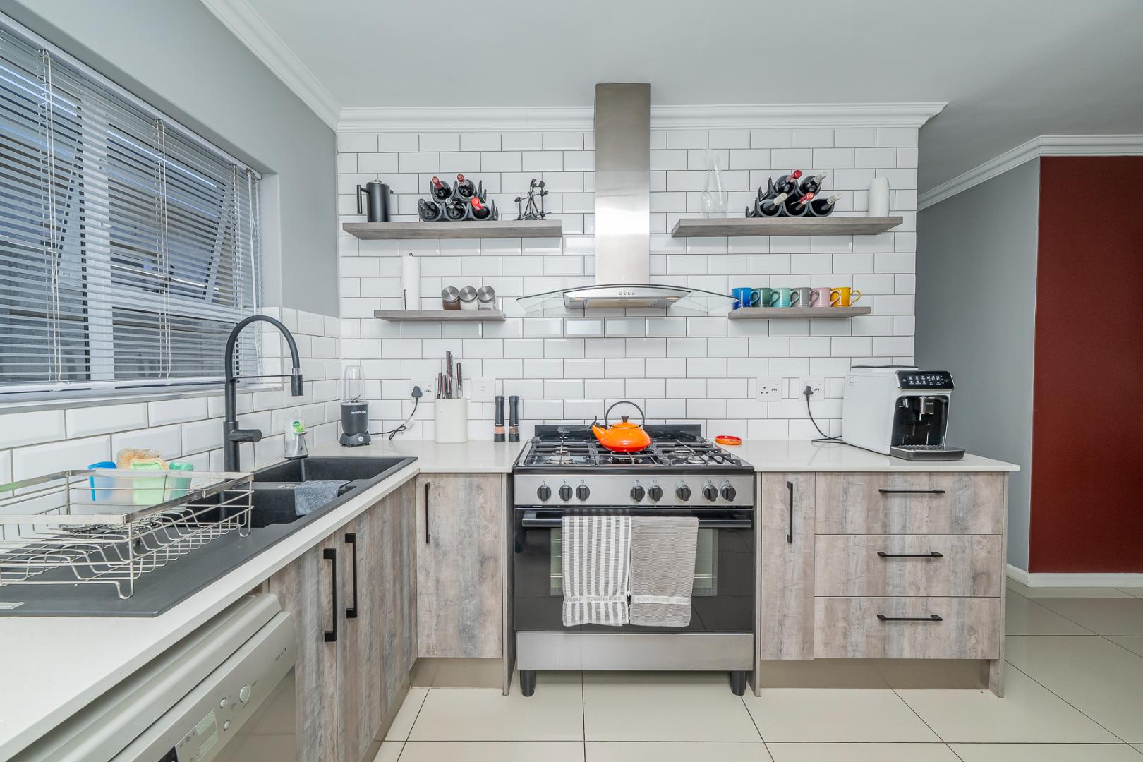 The modern kitchen is open plan with ample cupboard space and fitted with a gas stove as well as a water point for a dishwasher, making daily living convenient and efficient.