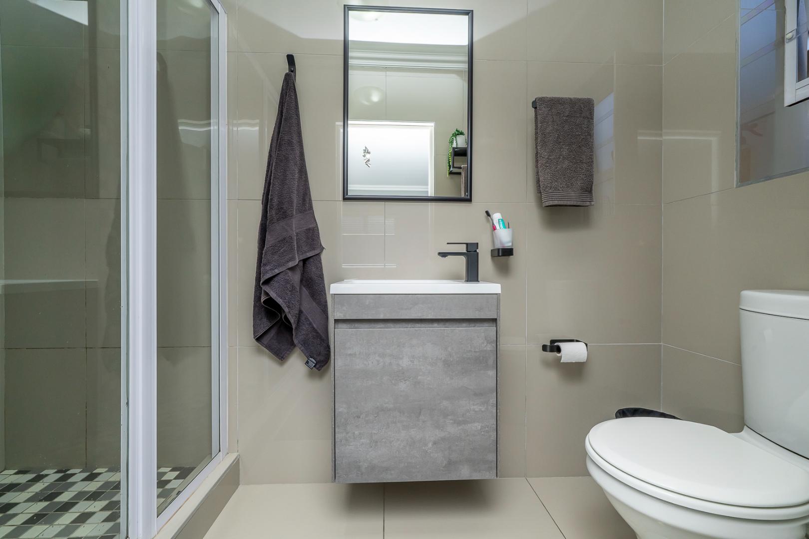 There are 2 bathrooms, both fitted with a shower, basin, and toilet.